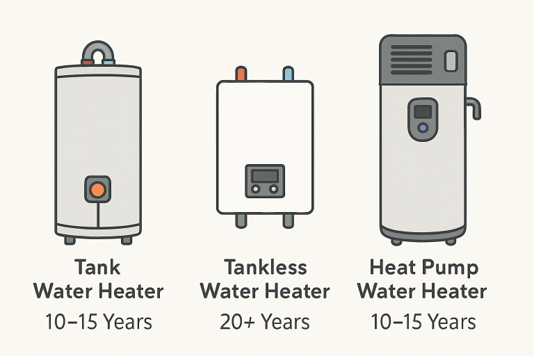 Water heater lifespan depends on the technology, usage, installation quality, and upkeep. Here is a quick breakdown of the most common water heater types: