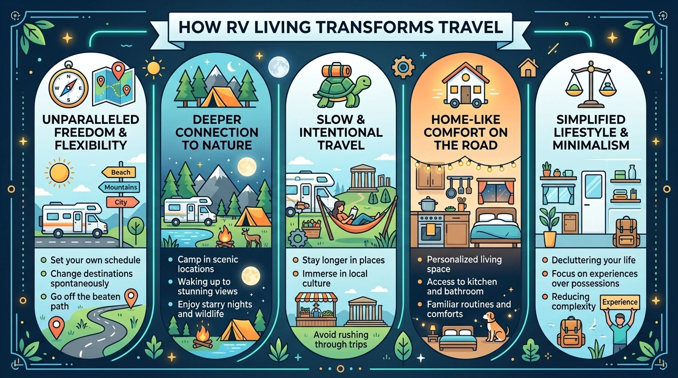 • RV living provides a unique blend of mobility and comfort, enabling travelers to explore various destinations without sacrificing the conveniences of home.